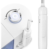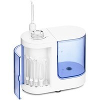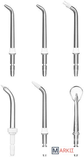 В комплекте идут различные насадки: 2 классические струйные насадки, насадка для удаления зубного камня и налёта из-под линии десны, насадка для ортодонтических конструкций, насадка с щёточкой для удаления налёта, насадка для чистки языка.Для хранения наиболее используемых насадок предусмотрен специальный отсек, который встроен в корпус сбоку и закрывается дверцей. Это очень удобно, ведь насадки будут всегда храниться в одном месте – они не потеряются.Конструкцией ирригатора предусмотрено магнитное крепление держателя насадок к корпусу ирригатора.Длина шнура: 1 м.
