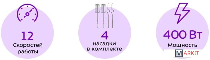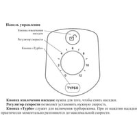 Класс защиты от поражения электрическим током: II;Материал корпуса: пластик;Материал насадок: хромированная сталь;Размеры: 95x145x195 мм;Вес: 1.12 кг.Комплектация:- миксер;- 2 венчика для взбивания;- 2 крюка для замеса;- руководство по эксплуатации.